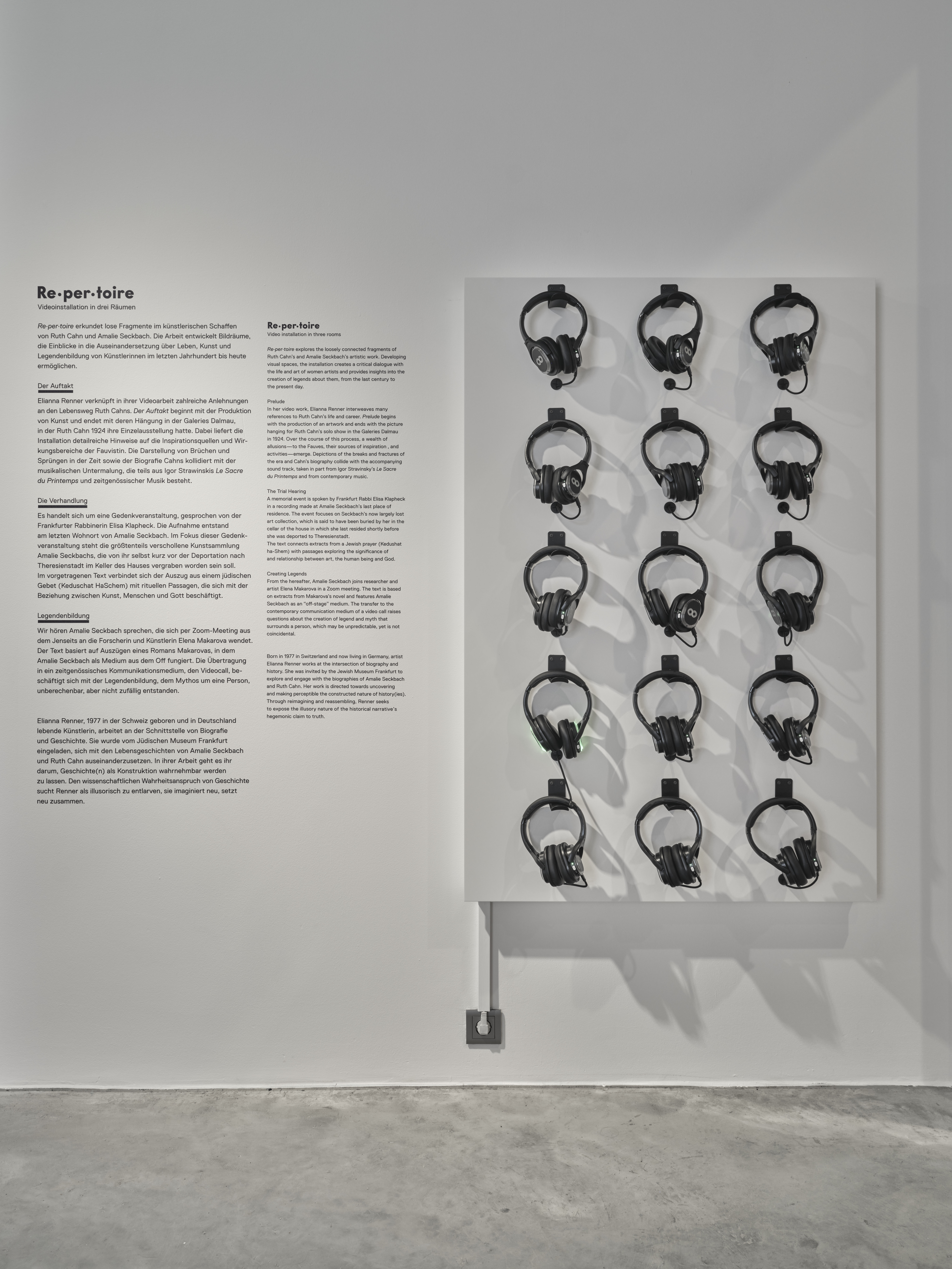 The re-per-toire explores loose fragments in the artistic work by Ruth Cahn and Amalie Seckbach. The work unfolds visual spaces that provide insights into their life, art and the creation of legends by female artists from the last century to the present day.